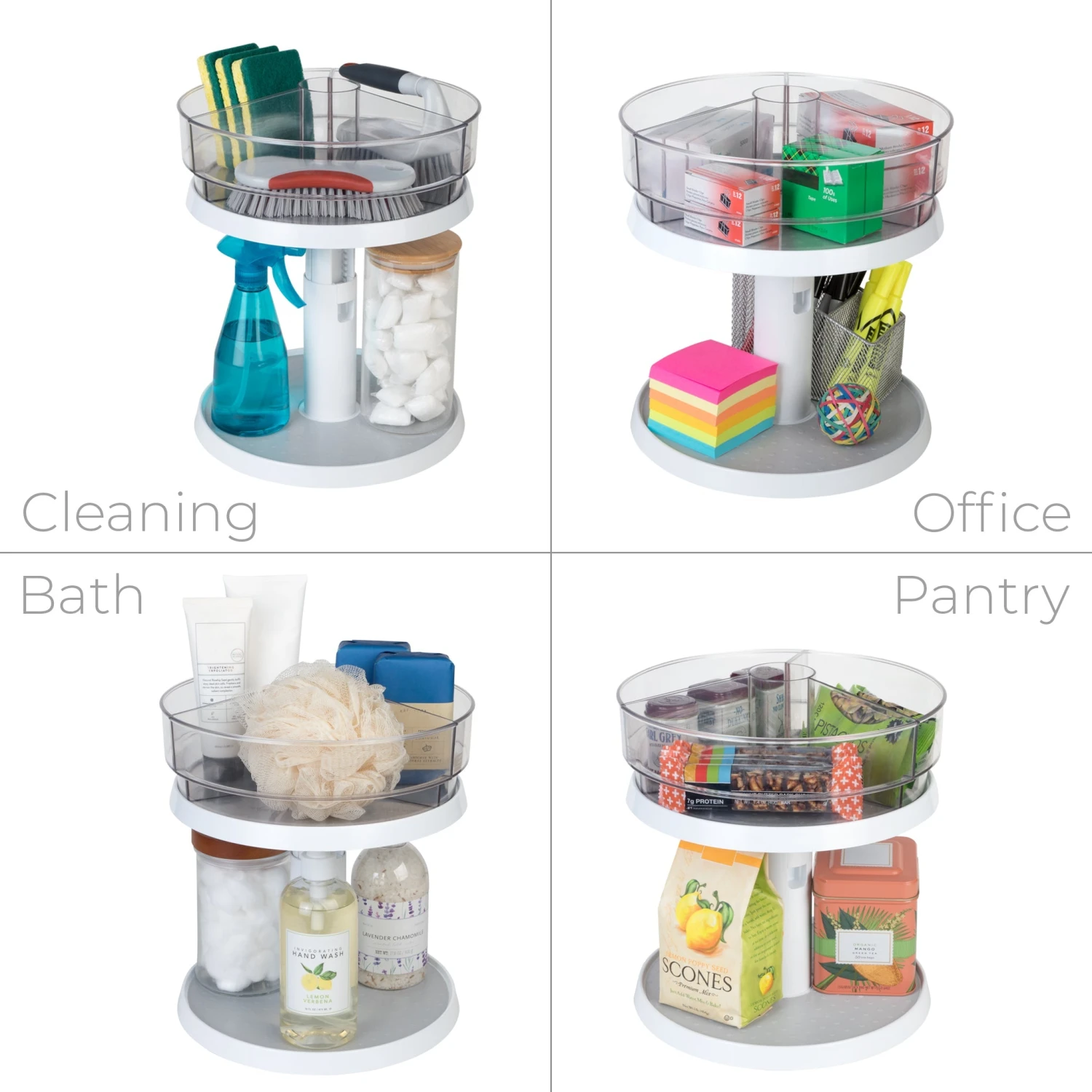 Organize your kitchen and create more space with this adjustable, 2-tiered turntable. Helps keep your kitchen, pantry, cabinets, bathroom, room or office organized.