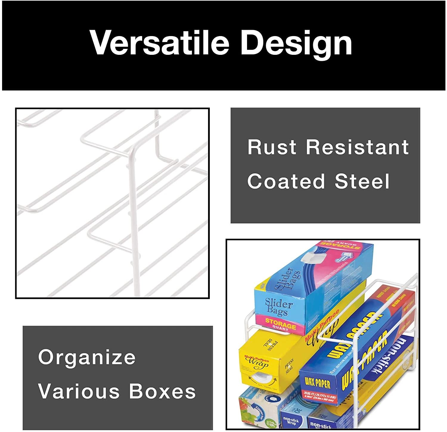 3-Tiers maximize the pantry or counter space in your kitchen by storing up to 9 wrap boxes.