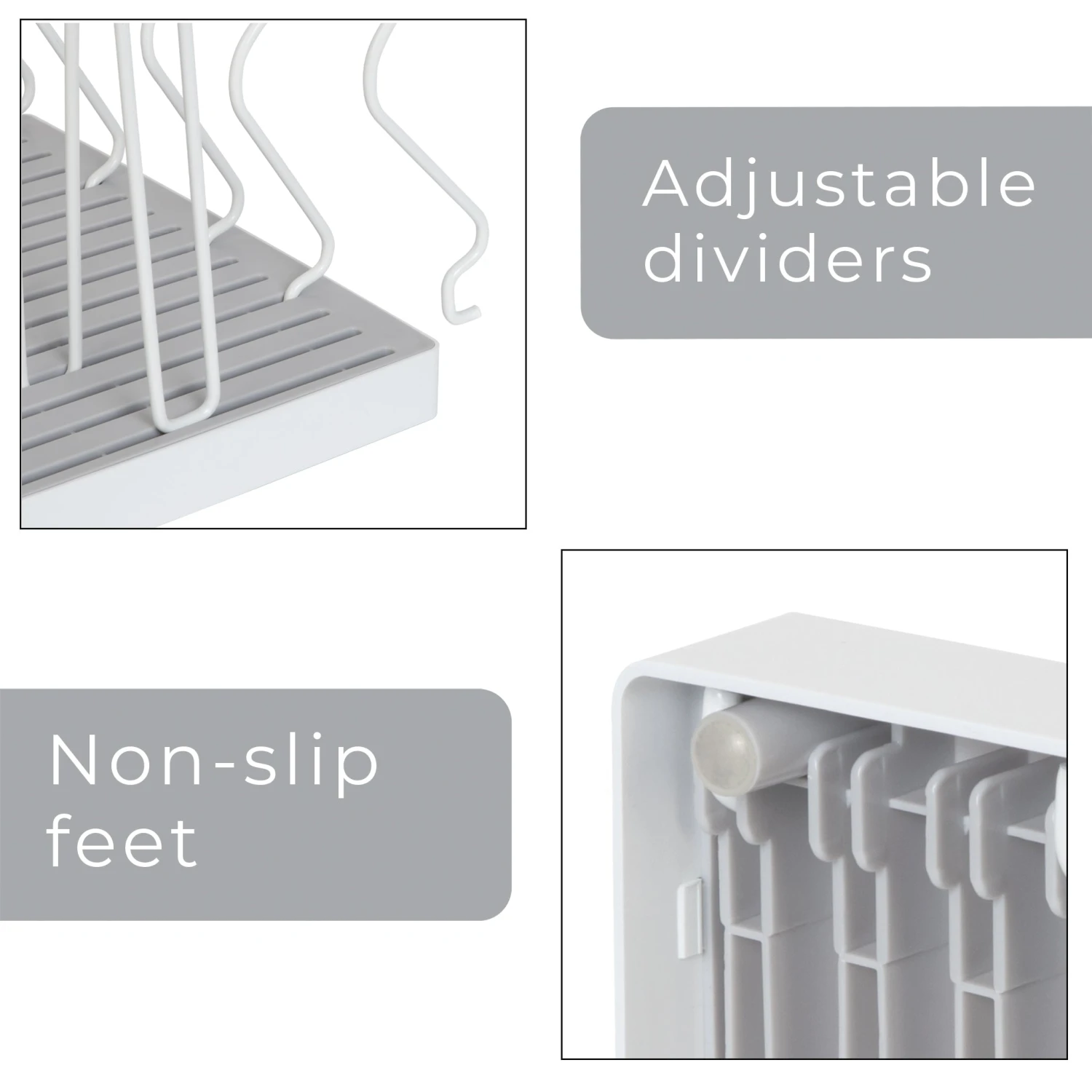 Sturdy base with non-slip feet ensure pans, lids, and bakeware stay securely in place.