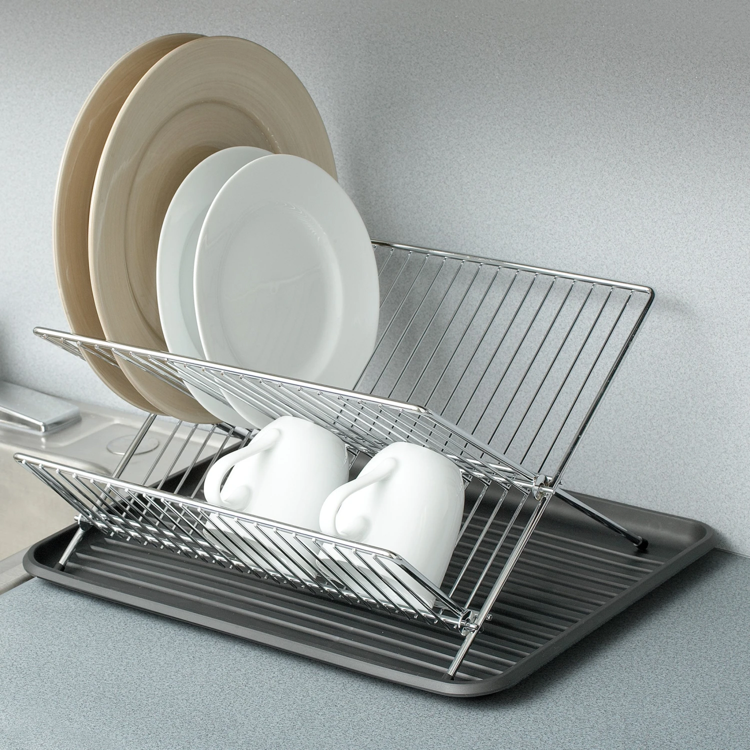 This sturdy Chrome Folding Dish Drainer has two-Tiers that fit a variety of dishware.