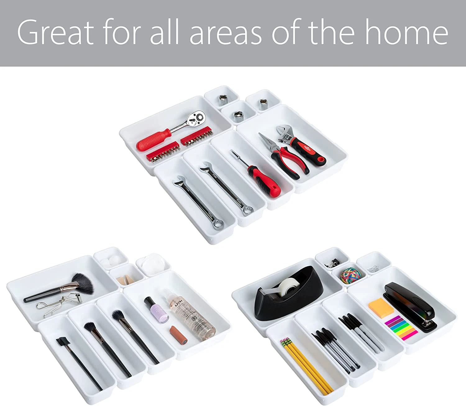 These drawer organizer trays were made for organizing your kitchen drawers and office drawers.