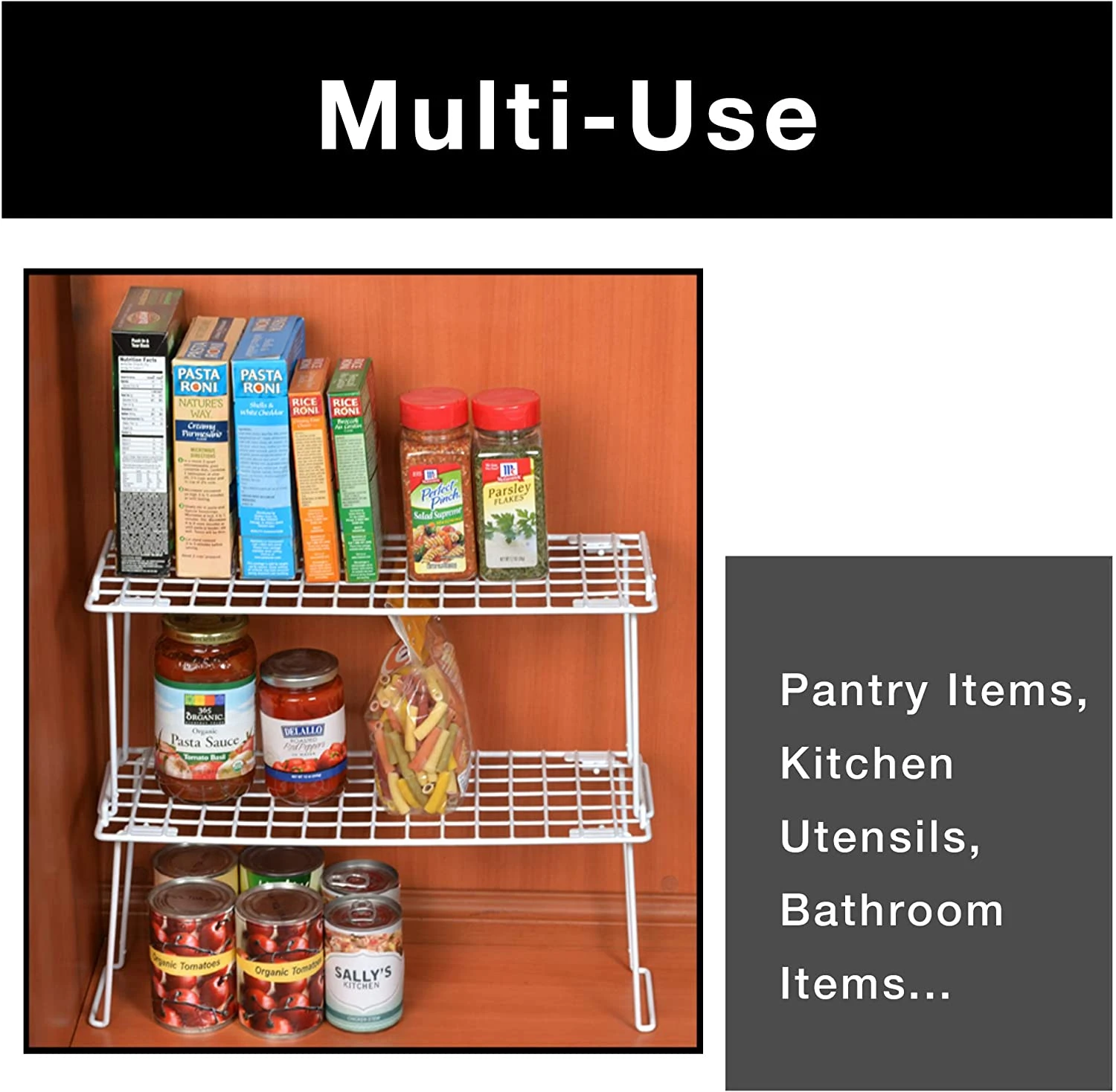 STACKING SHELF RACK – Ideal for kitchen cabinets, pantries, craft closets, bathroom cabinets