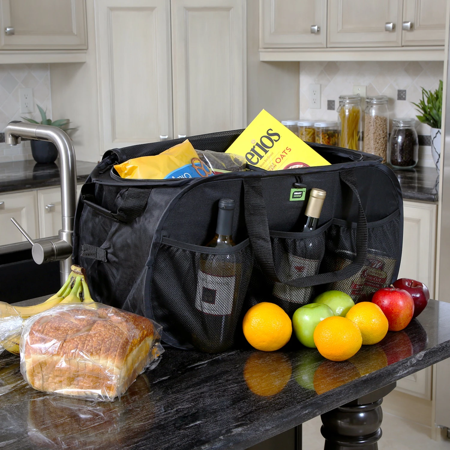 Smart Design Pop Up Car Trunk Organizer with Handles. Pop Up Car Trunk Organizer is useful for keeping your trunk organized. It can also be used to securely carry and hold your groceries. Includes easy-to-carry handles and durable polyester material for constant use. Pop Up Car Trunk Organizer with handles allows for optimal organization and folds flat for easy storage. Great for organizing your trunk, securing groceries, carrying sports equipment and organizing your home.