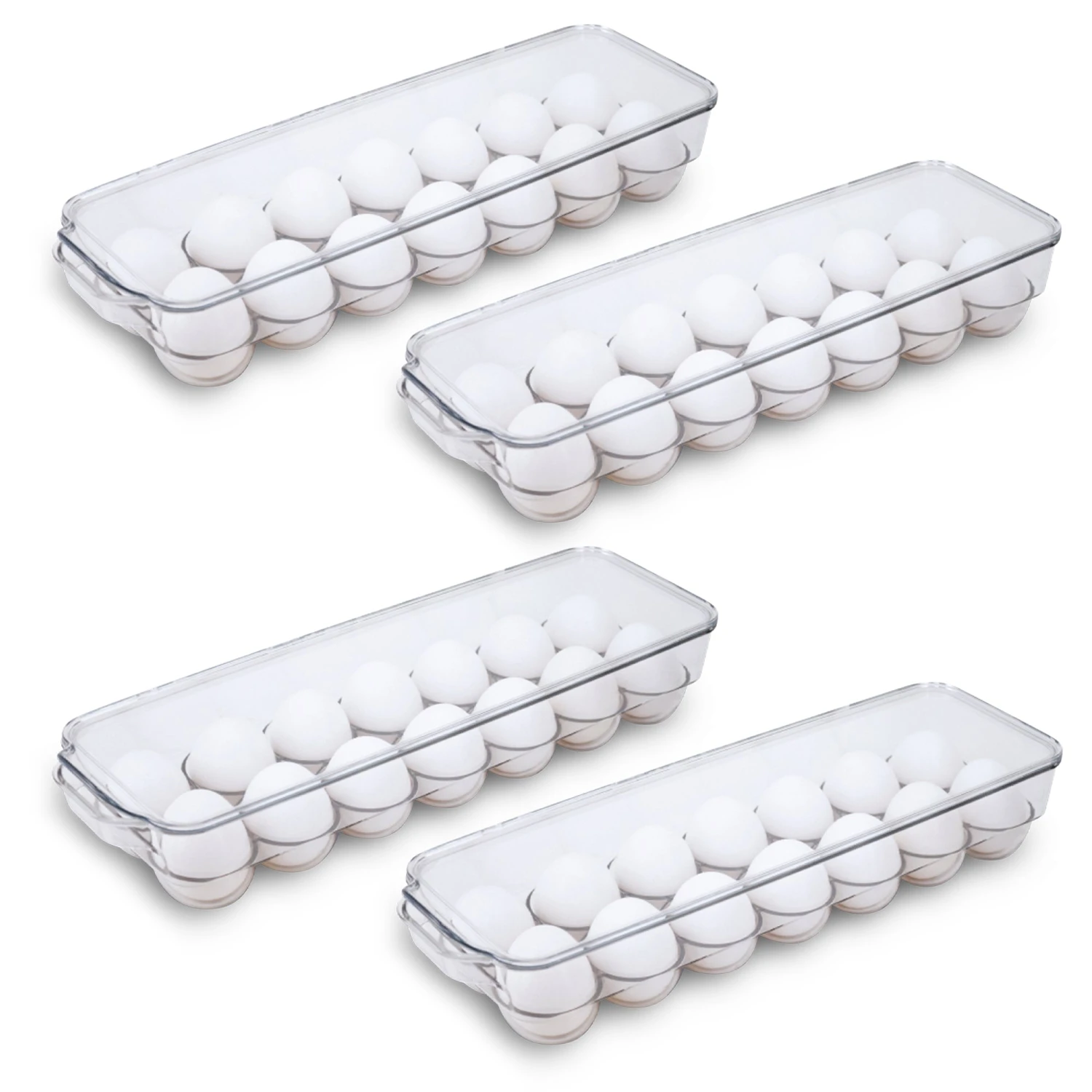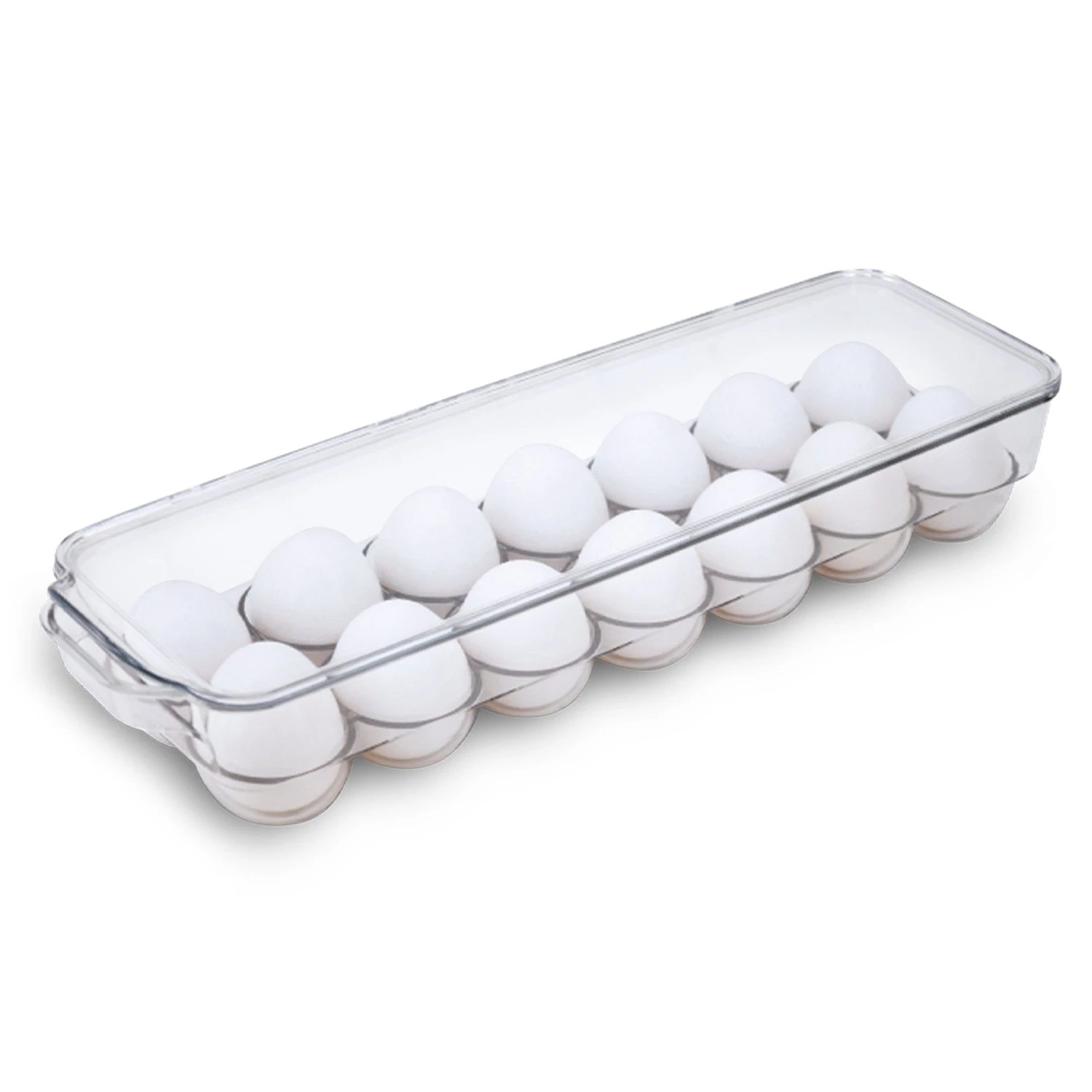 Organize your entire refrigerator and instantly create more space using this patented egg bin that holds 14 eggs.